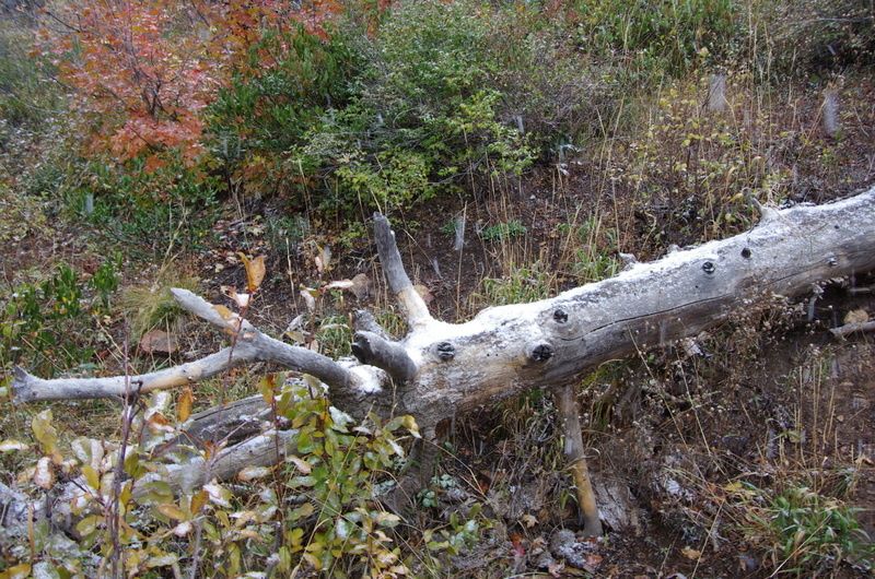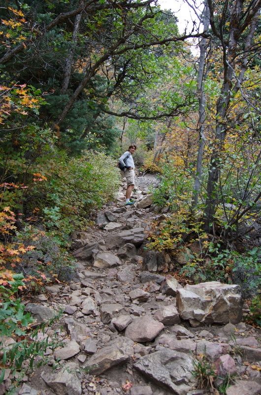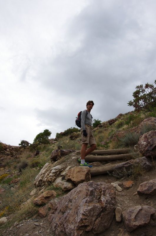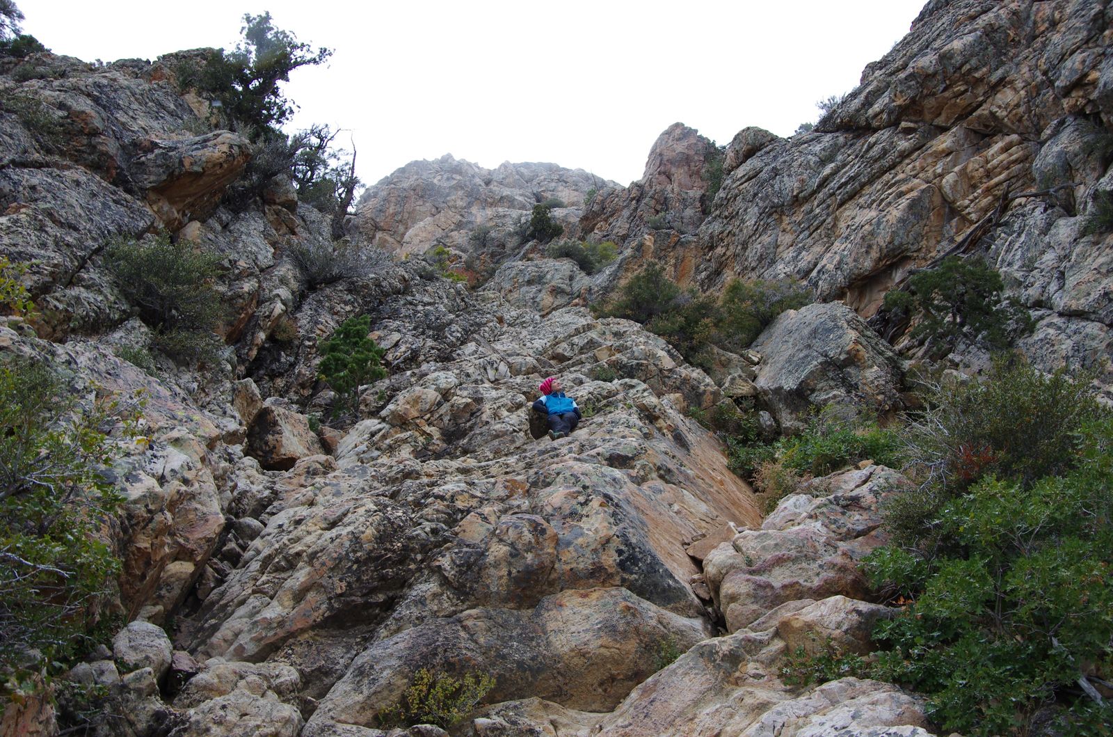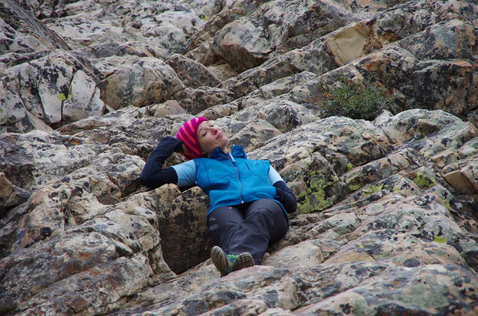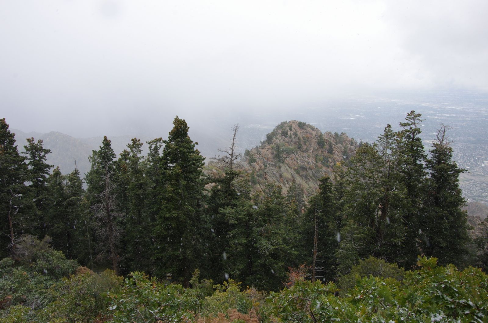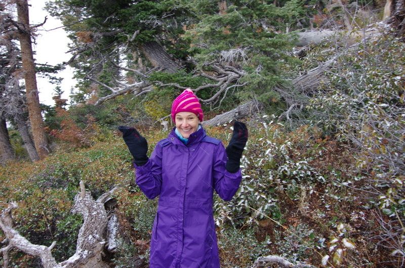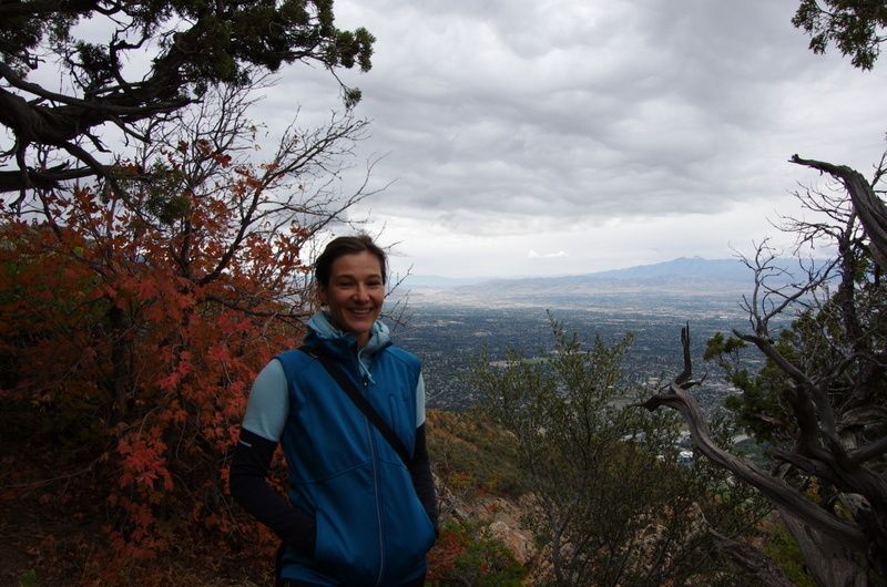 Jedenfalls fuhren wir anschließend gleich zum Fuße des Mount Olympus, den wir mittlerweile schon 2 Mal, immer mit Kind, in Angriff genommen hatten. Nach nur 10 Minuten Fahrt konnte es losgehen. Eine Strecke 3,5 Meilen (5,5 km) und 1300 Höhenmeter. Das Wetter war nicht das schönste, aber immerhin keine Hitze und kein Regen. Der Einstieg ist gleich sehr steil, dann wird es besser, und das letzte Drittel ist dann wieder sehr beschwerlich - auf keinen Fall mit Kind zu machen, da man teilweise auf allen Vieren kraxeln muss. Das letzte Stück ist nur mit Seil zu machen. Da, wo ich in der Wand stehe (nicht liege!) war Endpunkt unserer Wanderung. Mittlerweile hatte es auch zu schneien begonnen und ich war froh, dass ich mein Paar Ersatzsocken zu Handschuhen umfunktionieren konnte. Thomas hatte wohl auch nicht damit gerechnet, dass es soooo kalt werden würde. Ich hatte ihn noch gefragt, ob er nicht lieber eine lange Hose anziehen wolle. Auch bergab gestaltete sich schwierig, denn es war, wie gesagt, steil und mittlerweile auch rutschig. Wenn was passiert: Dort oben hat man keinen Handyempfang. Es war jedenfalls sehr schön, mit vielen schönen Ausblicken ins Tal und Einblicken in die hiesige Natur.